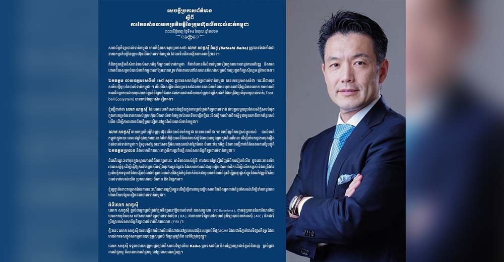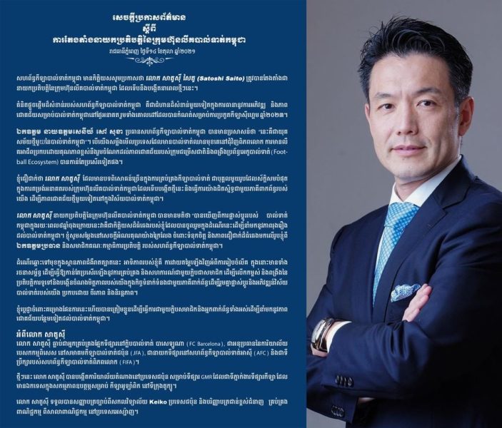 យោងតាមសេចក្ដីប្រកាសព័ត៌មានរបស់សហព័ន្ធ នៅព្រឹកថ្ងៃព្រហស្បតិ៍នេះ FFC បានធ្វើការតែងតាំងលោក សាតូស៊ី សៃតូ (Satoshi Saito) គឺជានាយកប្រតិបត្តិ(CEO) នៃក្រុមហ៊ុនលីគបាល់ទាត់កម្ពុជាខាងលើ ដែលលោកគឺធ្លាប់មានប្រវត្តិជាអ្នកគ្រប់គ្រងផ្នែកទីផ្សារនៅក្លិប FC Barcelona និងជាទីប្រឹក្សារបស់សហព័ន្ធកីឡាបាល់ទាត់ពិភពលោក(FIFA) ទៀតផង។