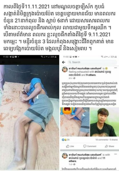 បន្ទាយមានជ័យ៖ យ៉ាងហោចណាមានមនុស្សចំនួន ៦នាក់ ដែលជាពលករខ្មែរ បានស្លាប់ជាបន្តបន្ទាប់ ខណៈជាង ១០នាក់ទៀត បាននិងកំពុងសង្គ្រោះបន្ទាន់នៅមន្ទីរពេទ្យ ក្រោយពីពួកគេបានយកទឹកអូអ៊ិឈិ លាយជាមួយអាល់កុល និងទឹកក្រូចផឹក នៅក្នុងមណ្ឌលចត្តាឡីស័កមួយកន្លែង នៅទីក្រុងប៉ោយប៉ែត ខេត្តបន្ទាយមានជ័យ កាលពីថ្ងៃទី១១ ខែវិច្ឆិកា ឆ្នាំ២០២១។