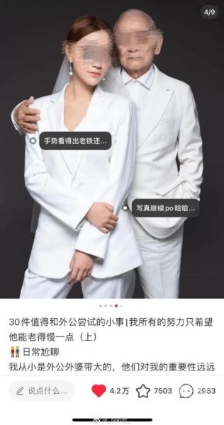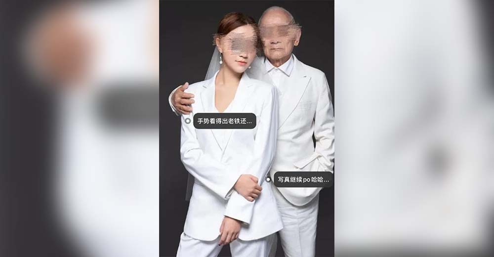 ចិន៖ ស្ត្រីម្នាក់ ត្រូវបានមនុស្សស្ទើរមួយប្រទេសជេរដោយសារមានអ្នកយករូបនាងទៅចែករំលែកលើបណ្តាញសង្គម កាលពីថ្ងៃអាទិត្យដោយសរសេរអះអាងថា៖ “បុរសចំណាស់វ័យ ៧៣ឆ្នាំម្នាក់ជាអ្នកជំនួយមានទ្រព្យស្តុកមកពីខេត្តគ័ងតុង ភាគខាងត្បូងប្រទេសចិន បានរៀបការជាមួយស្ត្រីវ័យ២៩ឆ្នាំម្នាក់មកពីខេត្ត គ័ងស៊ី ដោយឱ្យថ្លៃបណ្ណាការក្នុងទឹកប្រាក់ ១៣៧.០០០ដុល្លារ ផ្ទះតម្លៃ១៣៧.០០០ដុល្លារ និងរថយន្តទំនើបមួយគ្រឿង។”