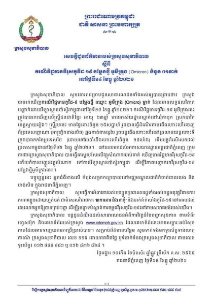 ភ្នំពេញ៖ ក្រសួងសុខាភិបាល ជូនដំណឹងថា៖ ក្រសួង បានរកឃើញករណ៍វិជ្ជមានកូវីដ១៩ បម្លែងថ្មី ឈ្មោះ អូមីក្រុង (Omicron) ម្នាក់ ដែលមានលទ្ធផលវិភាគ បញ្ជាក់ដោយវិទ្យាស្ថានប៉ាស្ទ័រកម្ពុជានៅថ្ងៃទី១៤ ខែធ្នូ ឆ្នាំ២០២១។