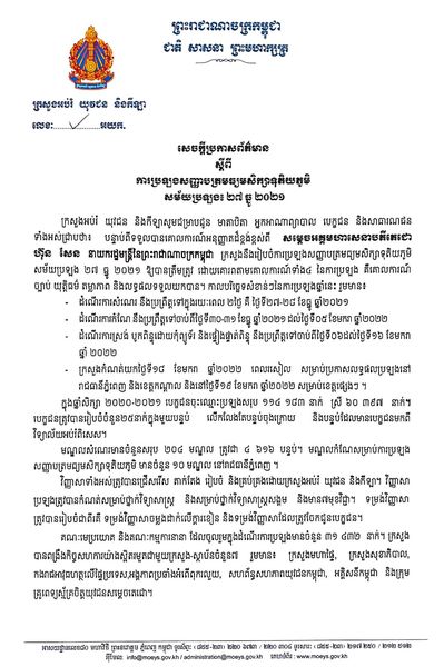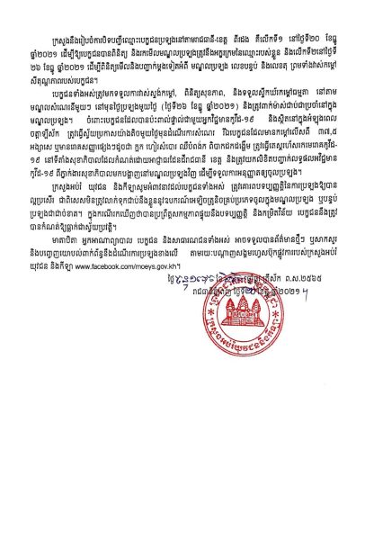 -ក្រសួងកំណត់យកថ្ងៃទី១៨ ខែមករា ឆ្នាំ២០២២ ពេលរសៀល សម្រាប់ប្រកាសលទ្ធផលប្រឡងនៅ រាជធានីភ្នំពេញ និងខេត្តកណ្តាល និងនៅថ្ងៃទី១៩ ខែមករា ឆ្នាំ២០២២ សម្រាប់ខេត្តផ្សេងៗ ។
