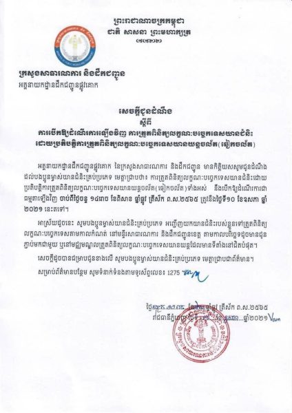 ភ្នំពេញ៖ មណ្ឌលត្រួតពិនិត្យលក្ខណៈបច្ចេកទេសយានយន្ត (ឆៀក) ទីតាំងពោធិ៍សែនជ័យ-អូដឹម បានដាក់ឱ្យដំណើរការសាកល្បង ចាប់ពីថ្ងៃទី២១ ខែមករា ឆ្នាំ២០២១ នេះតទៅ។ នេះបើយោងតាមការប្រកាសរបស់ក្រសួងសាធារណការ និងដឹកជញ្ជូន នៅព្រឹកថ្ងៃចន្ទទី២៤ ខែមករានេះ។
