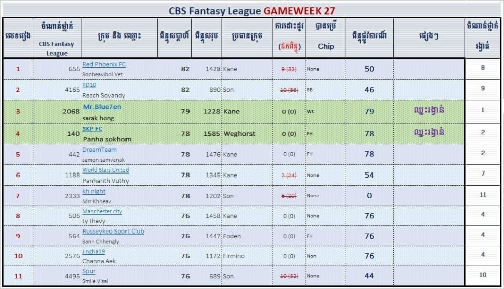 -លេខ២៖ Panha sokhom (ឈ្មោះក្រុម SKP FC) ទទួលបាន ៧៨ ពិន្ទុក្នុងសប្ដាហ៍ទី២៧ (ពិន្ទុសរុប ១៥៨៥)