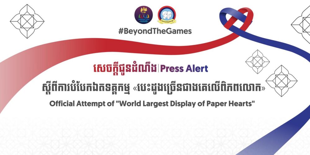 ក្រុមការងារនៃយុទ្ធនាការ Beyond The Games នឹងរៀបចំការបំបែកឯតទគ្គកម្មពិភពលោក “បេះដូងច្រើនជាងគេលើពិភពលោក”ក្នុងឱកាសដែលកម្ពុជាធ្វើជាម្ចាស់ផ្ទះ នៃព្រឹត្តិការណ៍កីឡាស៊ីហ្គេមលើកទី៣២ និងអាស៊ានប៉ារ៉ាហ្គេមលើកទី១២ នៅថ្ងៃទី១១ ខែមេសា ឆ្នាំ២០២៣ វេលាម៉ោង ៤រសៀលតទៅ នៅបរិវេណប្រាសាទអង្គរវត្ត។