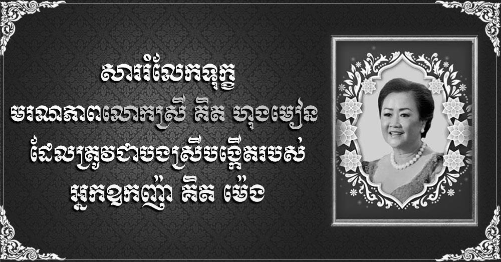 យើងខ្ញុំសូមចូលរួមសម្ដែង នូវសេចក្តីសោកស្ដាយស្រណោះ អាឡោះអាល័យបំផុតជាមួយអ្នកឧកញ៉ា និងលោកជំទាវ ព្រមទាំងក្រុមគ្រួសារ ចំពោះការបាត់បង់លោកស្រី គិត ហុងមៀន ជាបងស្រីបង្កើត ជាបងស្រីថ្លៃ ជាឧត្តមភរិយា ជាម្តាយ ជាម្តាយក្មេក និងជាជីដូន ដែលជាទីគោរពស្រលាញ់ដ៏ជ្រាលជ្រៅ និងប្រកបដោយសង្គហធម៌ដ៏ថ្លៃថ្លាបំផុត ព្រហ្មវិហារធម៌មិនចេះរីងស្ងួត ដោយមួយជីវិតរបស់លោកស្រី បានលះបង់ទាំងកម្លាំងកាយ និងប្រាជ្ញាស្មារតី មិនគិតពីការនឿយហត់លំបាកលំបិន ជំនះរាល់ឧបសគ្គនានា ក្នុងការចិញ្ចឹមបីបាច់ថែរក្សា និងអប់រំ ទូន្មានបុត្រាបុត្រី ឱ្យក្លាយជាកុលបុត្រ កុលធីតា ប្រកបដោយគន្លងធម៌សម្រាប់សង្គមជាតិ។