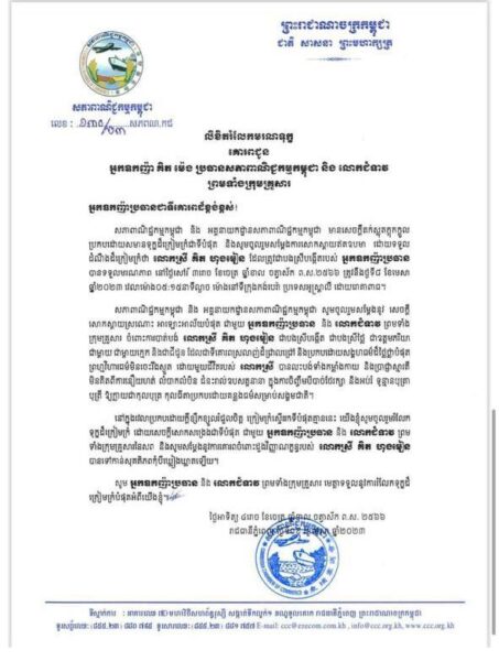 ភ្នំពេញ៖ សភាពាណិជ្ជកម្មកម្ពុជា និងអគ្គនាយកដ្ឋានសភាពាណិជ្ជកម្មកម្ពុជា បានផ្ញើសារចូលរួមរំលែកទុក្ខដ៏ក្រៀមក្រំ ជូនអ្នកឧកញ៉ា គិត ម៉េង ប្រធានសភាពាណិជ្ជកម្មកម្ពុជា និងលោកជំទាវ ព្រមទាំងក្រុមគ្រួសារ ចំពោះមរណភាពរបស់លោកស្រី គិត ហុងមៀន ដែលត្រូវជាបងស្រីបង្កើត របស់អ្នកឧកញ៉ា។