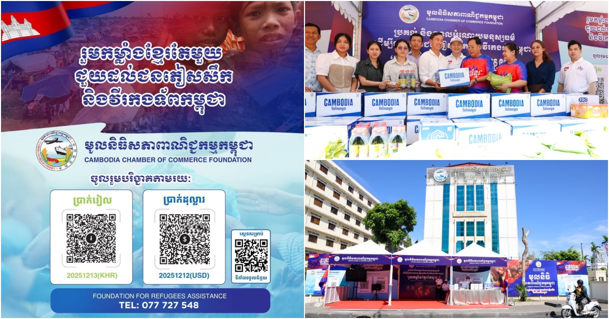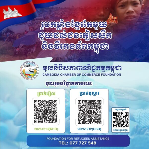 ដើម្បីឆ្លើយតបន្ទាន់ទៅនឹងកំណើនជនភៀសសឹក និងតម្រូវការចាំបាច់នៅមណ្ឌលជនភៀសសឹកនានា សភាពាណិជ្ជកម្មកម្ពុជា អំពាវនាវឲ្យសមាជិក សមាជិកា សប្បុរសជន និងសាធារណៈជន អញ្ជើញចូលរួមទាំងអស់គ្នាក្នុងការរៀបចំវេចខ្ចប់ អំណោយសប្បុរសធម៌ នៅអគ្គនាយដ្ឋានសភាពាណិជ្ជកម្មកម្ពុជា (អគារលេខ7D មហាវិថីសហព័ន្ធរុស្សី សង្កាត់ទឹកល្អក់១ ខណ្ឌទួលគោក រាជធានីភ្នំពេញ)៕